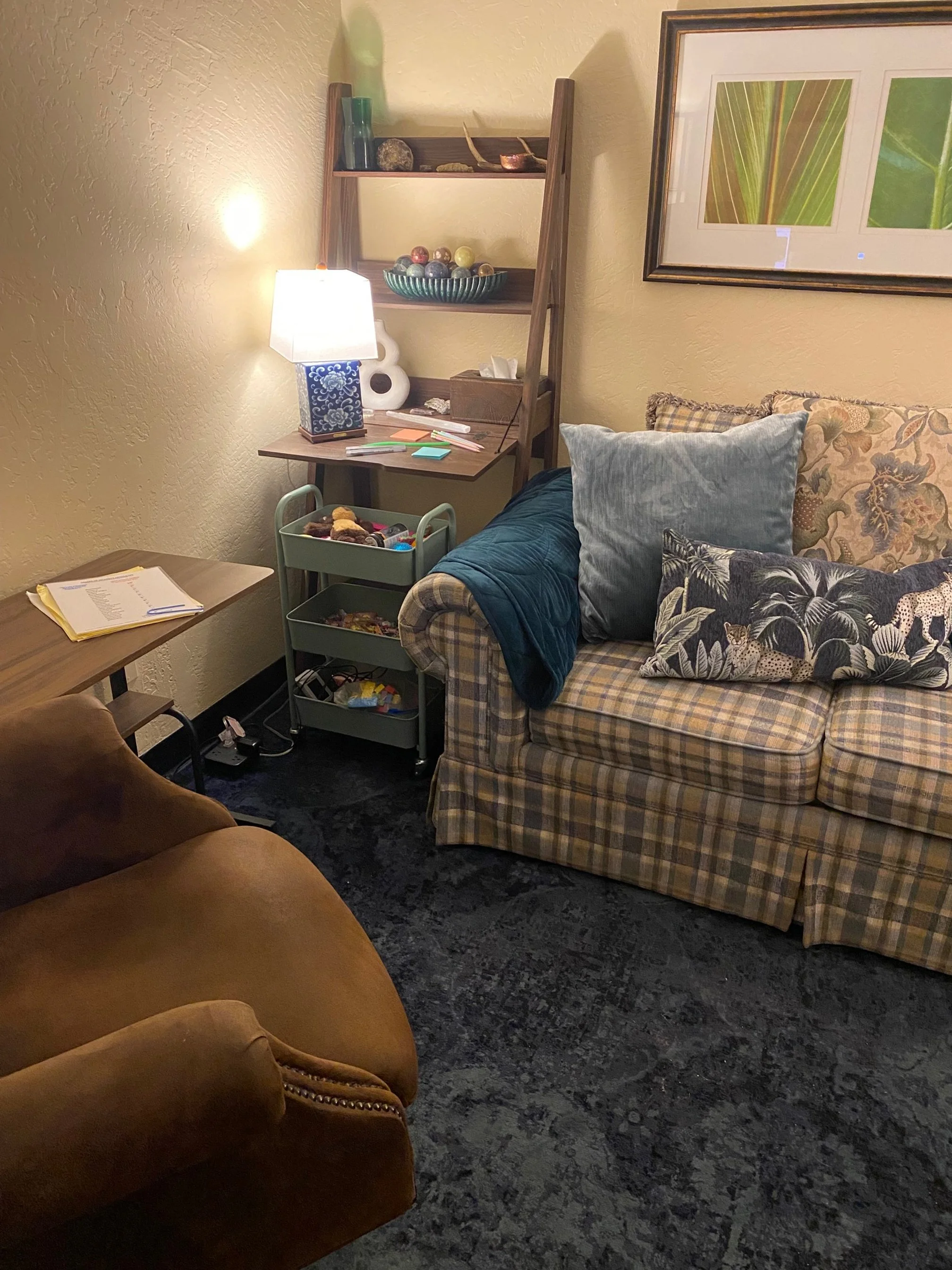 I’ve designed my office space to be a place where you can exhale—a space that feels safe, comfortable, and supportive of your needs. Every detail has been intentionally chosen to create an environment that fosters reflection, regulation, and a sense of ease.